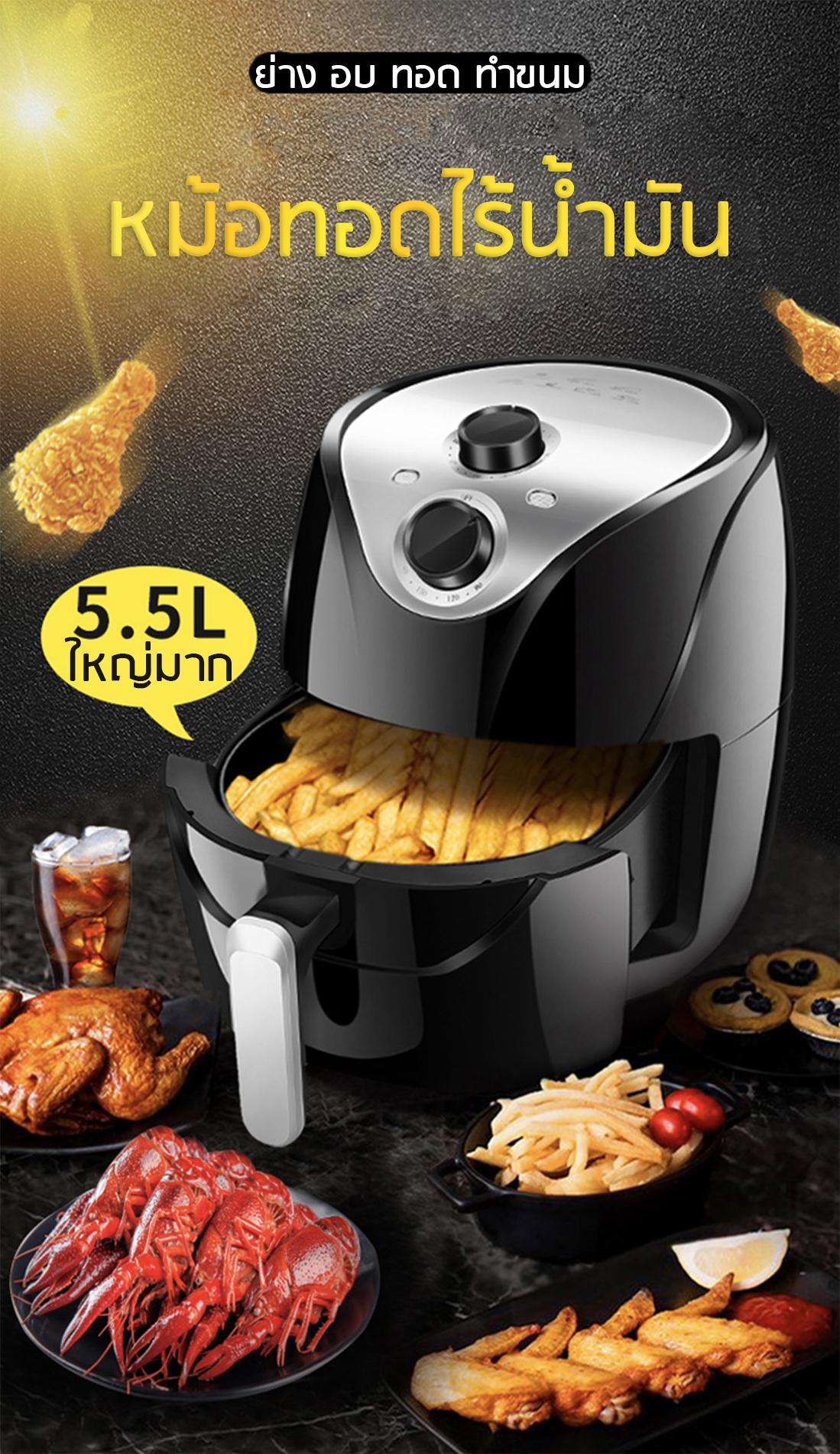 หม้อทอดเทปลอนไฟฟ้าไร้น้ำมันอเนกประสงค์(ทอด ย่าง อบและทำขนม) ขนาด5.5ลิตร ใหญ่มาก!